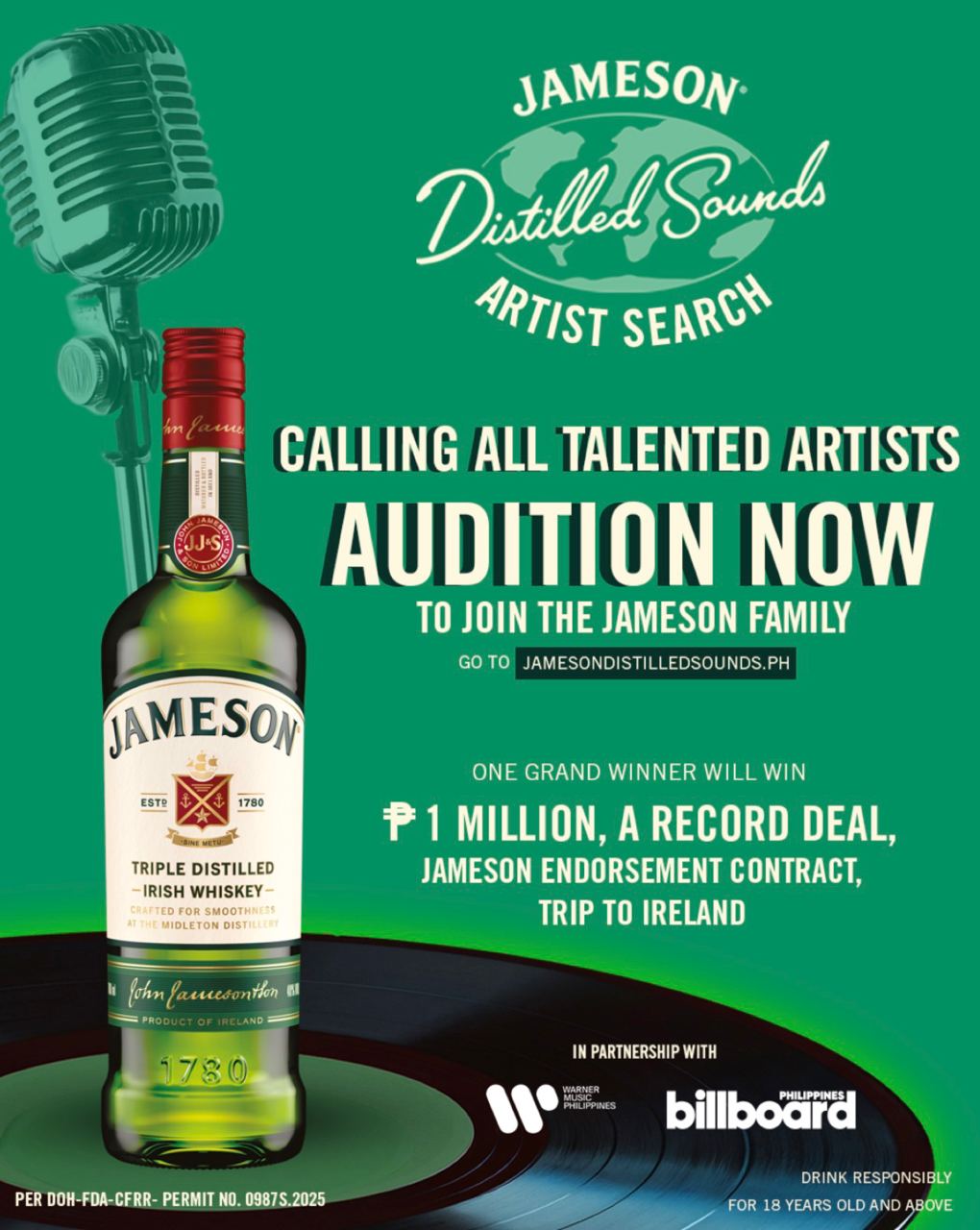 One grand prize winner will receive a ₱1,000,000 cash prize, a trip to Ireland, a one-year record deal with Warner Music Philippines, and a one-year endorsement deal with Jameson Irish Whiskey Philippines. This is intended to support the winner’s transition into the professional music industry, with the backing of a label, a brand, and a team experienced in artist development.