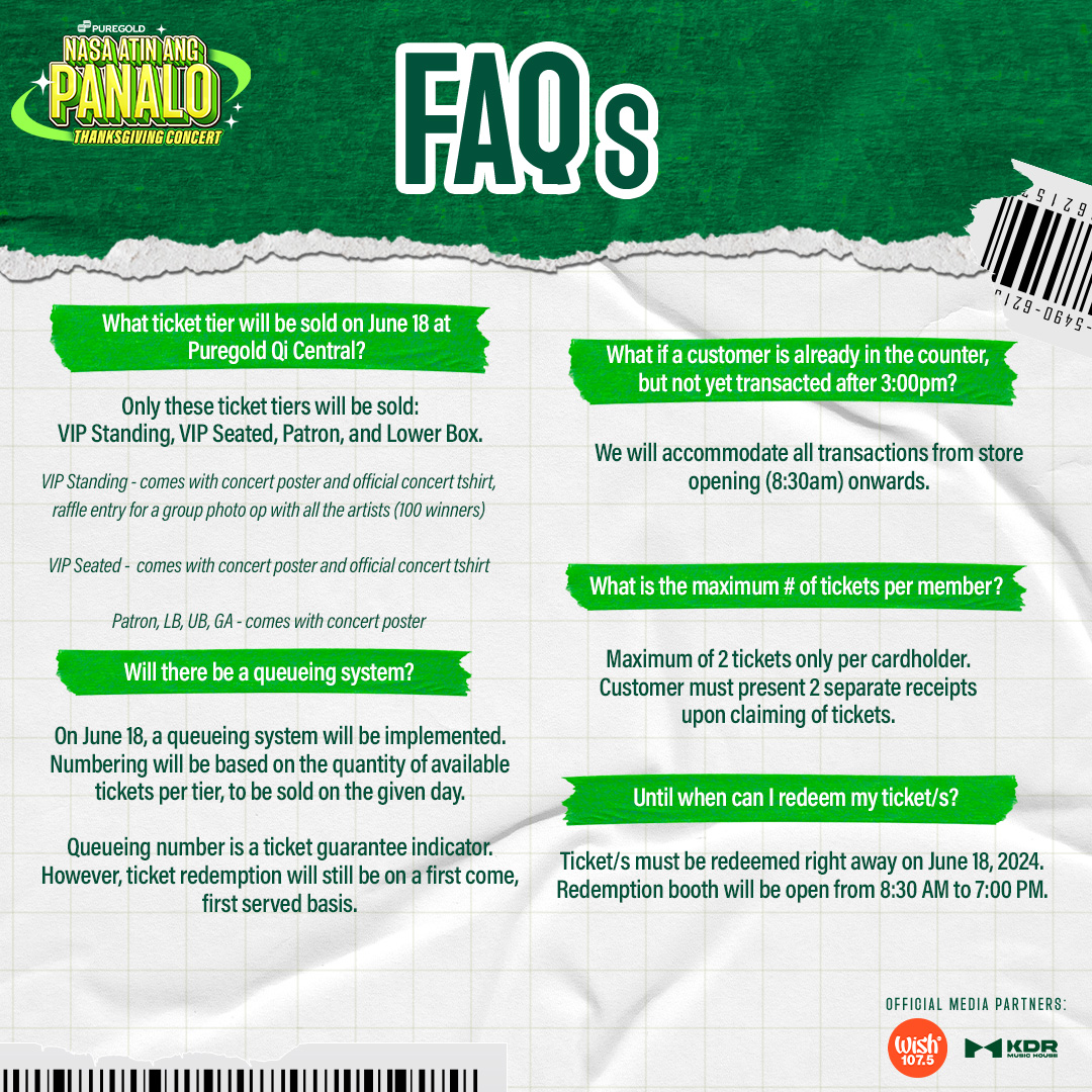 Transactions from 8:30 a.m onwards will be honored for ticket redemption. However, redeeming a ticket will be based on a first come first served basis. Each cardholder can only redeem a maximum of 2 tickets, with separate receipts must be presented for each ticket. The virtual Perks and Aling Puring cards on the Puregold Mobile App will also be honored at the ticketing event.