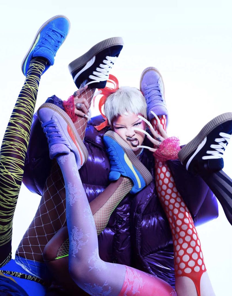 This version features an oversized build with a stacked gum sole that adds substantial edge to the classic design and comes in eye-catching colorways like Black/White, Blue/Green, and Lavender/Cherry Red. Rihanna, reflecting on the updated design, emphasized, “We took our OG Creeper and made it bigger and badder,” highlighting the Creeper Phatty as a reinvention that fulfills fans’ desire for a bold, statement-making return of this classic silhouette.