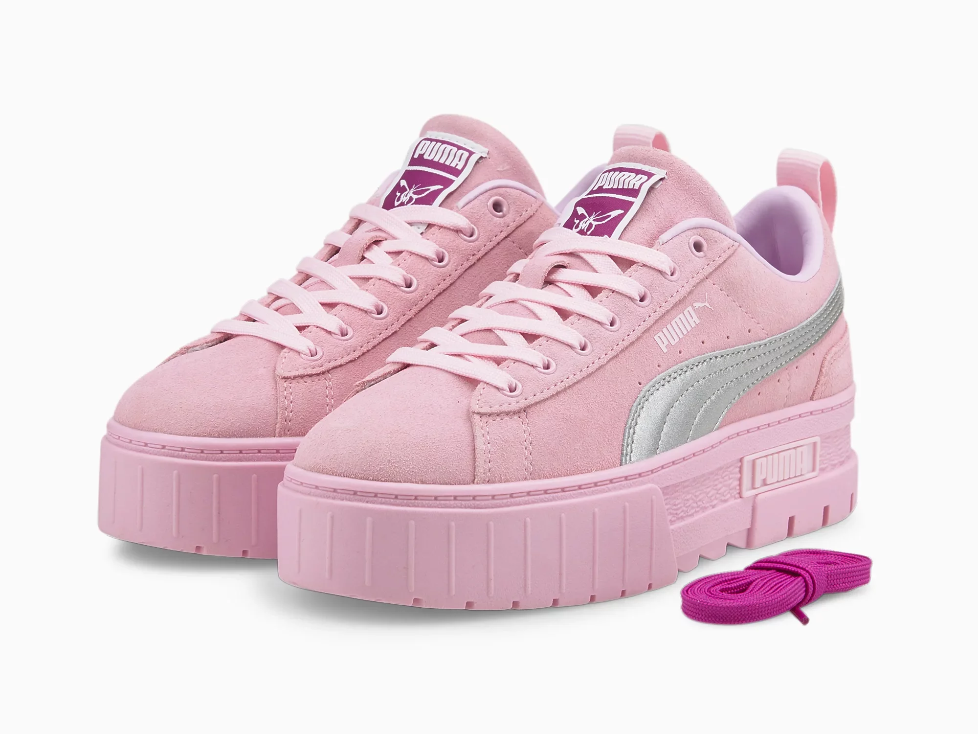 The second season of PUMA x Dua Lipa turns up the metallic moment and douses everything in pink. The light pink suede upper, set atop a matching stacked rubber midsole, is complemented by a striking silver metallic formstripe. Inspired by the ’90s rave scene, these sneakers are primed to be the life of every party.