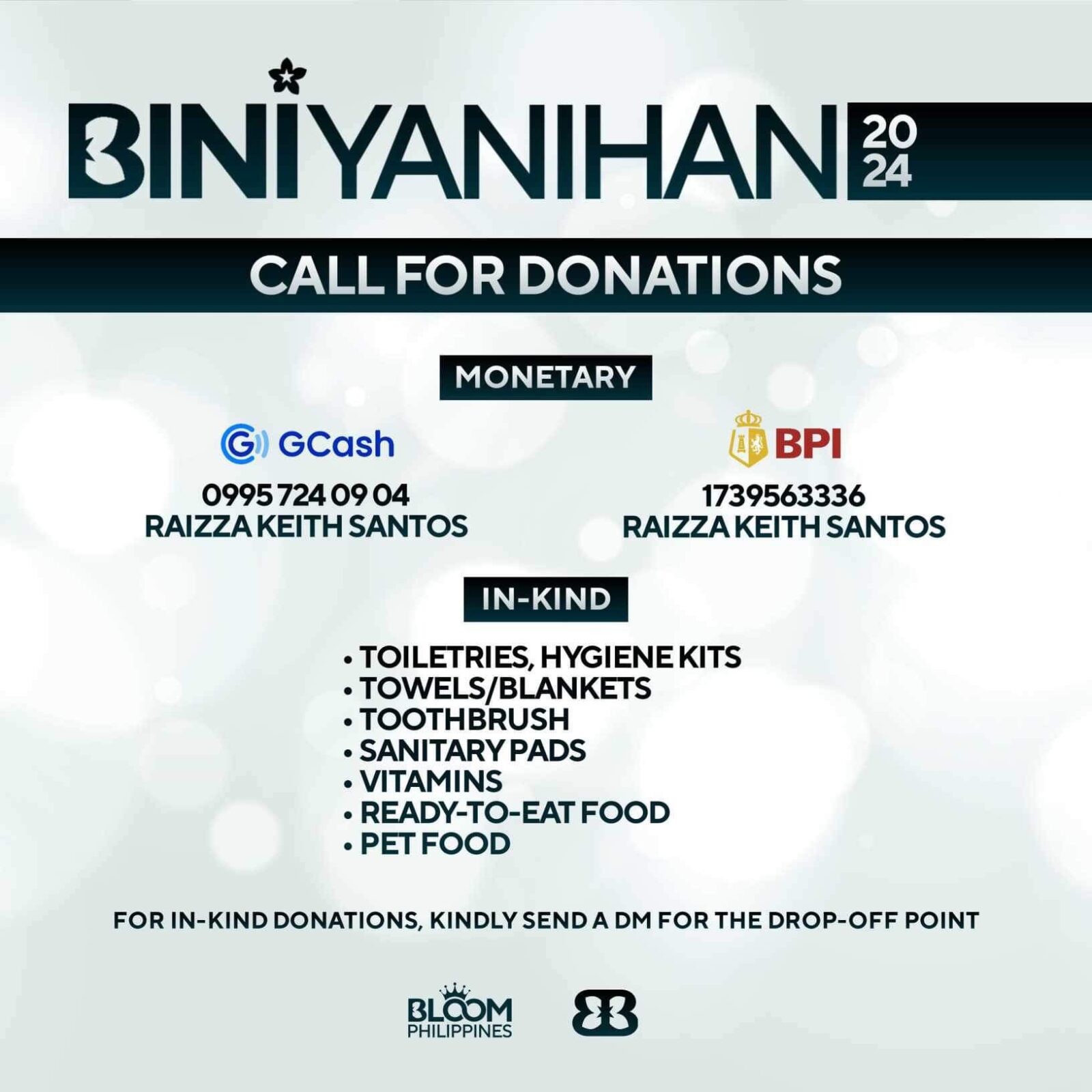 BINI’s fanbase, the BLOOMs, are accepting cash as well as in-kind donations in the form of toiletries, ready-to-eat food, medicine, and more. The cash donations will be donated to Angat Buhay Foundation under BINI and BLOOMs. Access their donation tracker here. For the in-kind donations’ drop-off location, you may send the fanbase a message here.