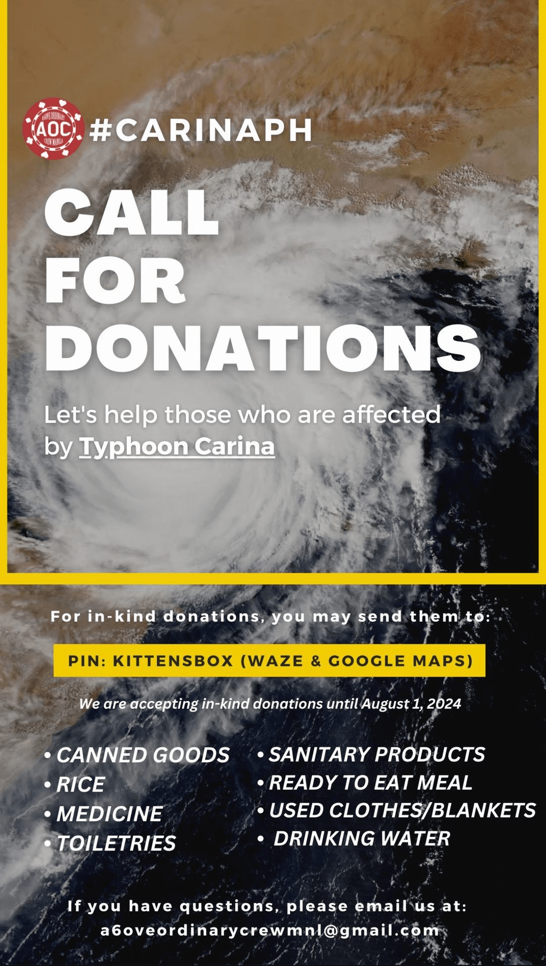 The effects of the typhoon have left many communities in need of all kinds of aid and assistance, including donations in the form of food, drinking water, clothing, medicine and more, as well as monetary provisions and shelter. These donations will go to affected communities in many areas in Central and Northern Luzon, as well as in various parts of Metro Manila, including Marikina and Quezon City.