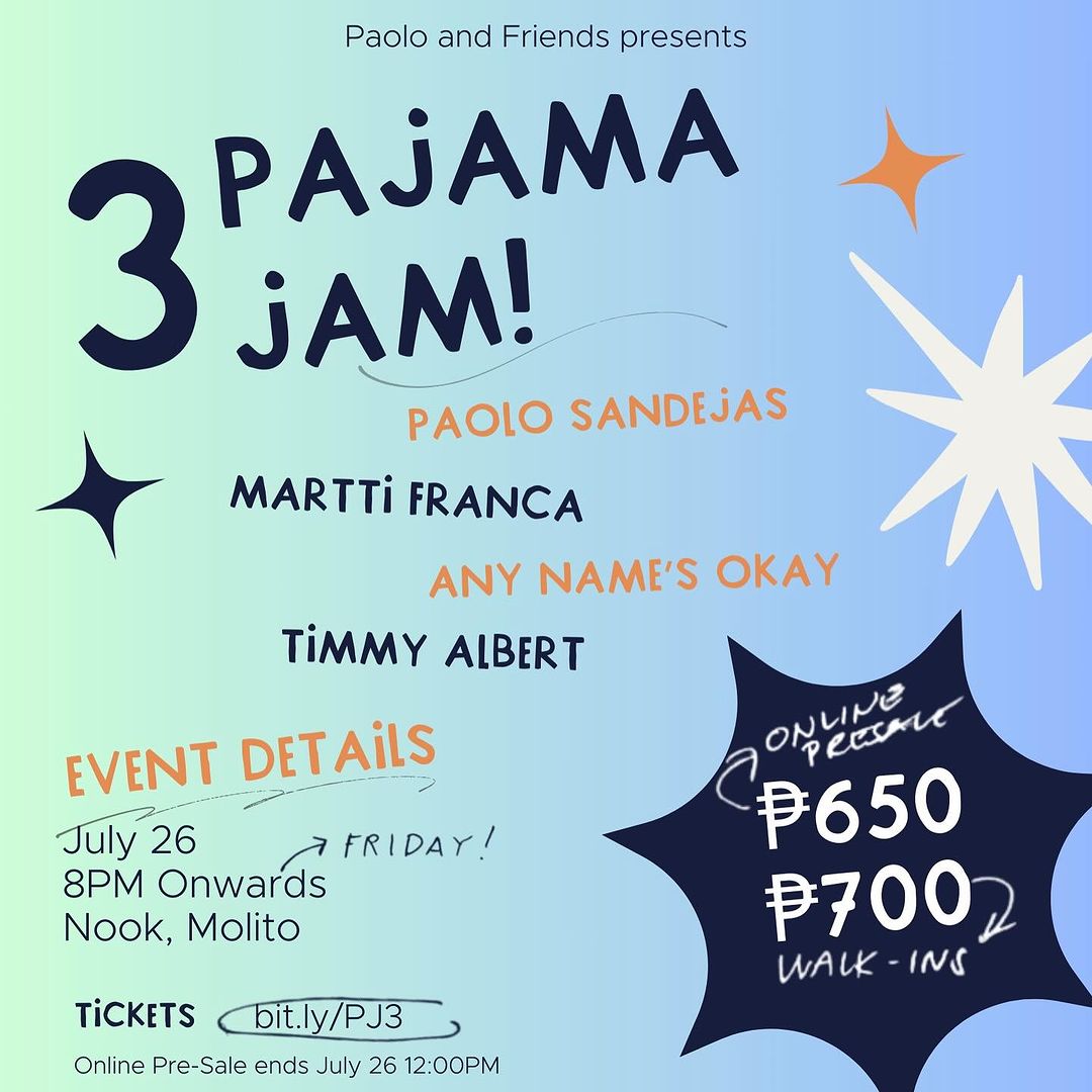 Paolo Sandejas‘ Pajama Jam 3 gig featuring him, Martti Franca, Any Name’s Okay, and Timmy Albert will be donating all of the show’s proceeds to relief efforts for those affected by Typhoon Carina. The show will be held tonight, July 26 at Nook in Molito Lifestyle Center, Muntinlupa City.