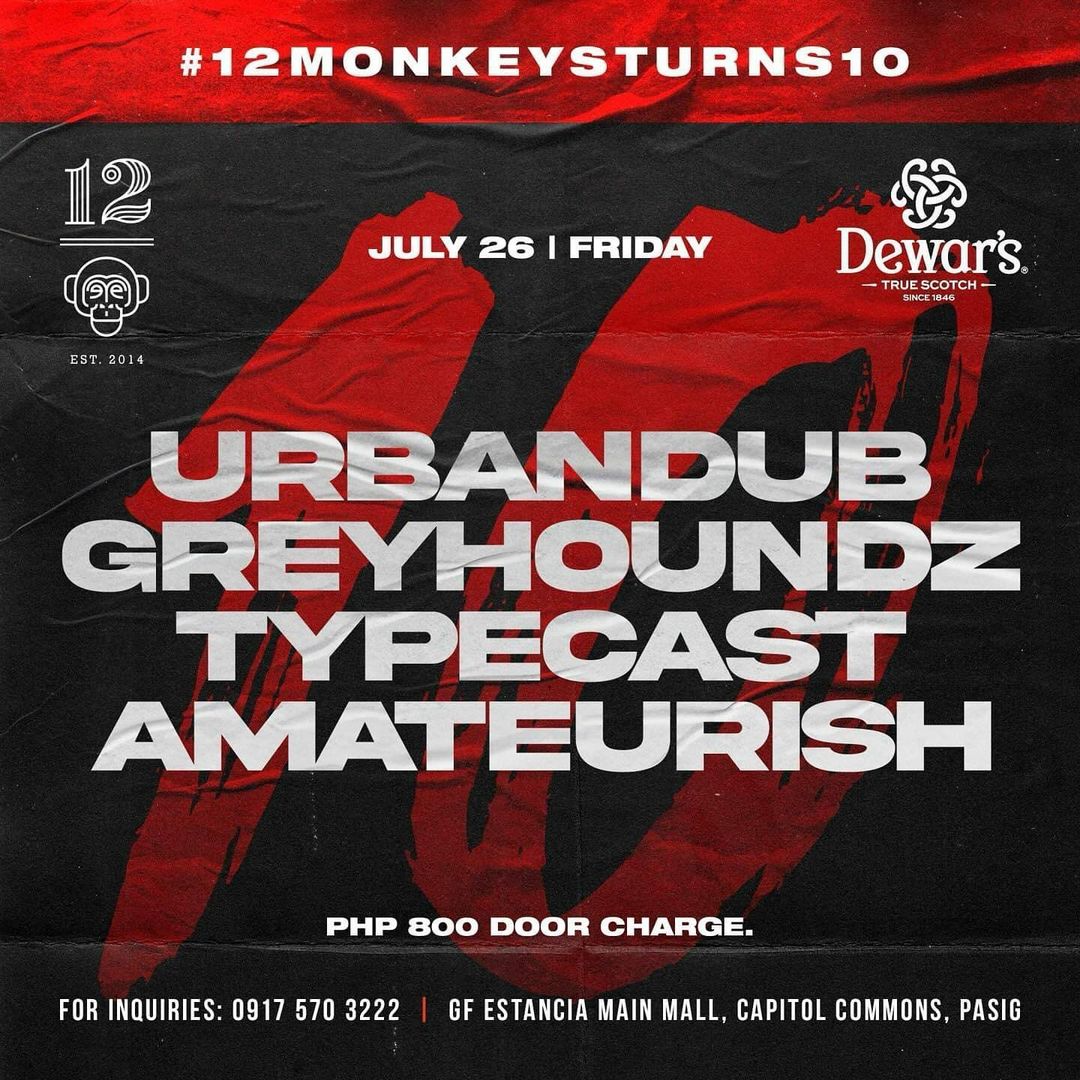 Urbandub, Greyhoundz, Typecast, and Amateurish, are performing at 12 Monkeys at the Estancia Mall in Pasig City tonight (July 26) for the venue’s `10th anniversary celebrations, with part of the proceeds being donated to those affected by Typhoon Carina.