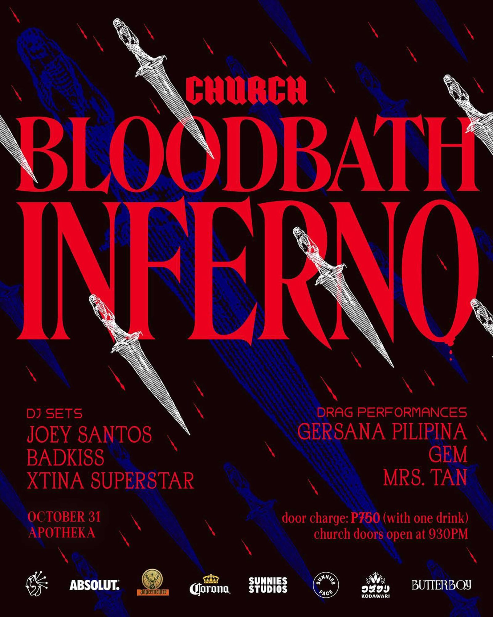 “Church VI: Bloodbath Inferno” will go down at Makati’s Apotheka Manila on October 31. For a door charge of P750 (including a drink and a shot), guests will be treated to DJ sets from Badkiss, Joey Santos, and Xtina Superstar, as well as drag performances from Gersana Pilipina, Gem, and Mrs. Tan.