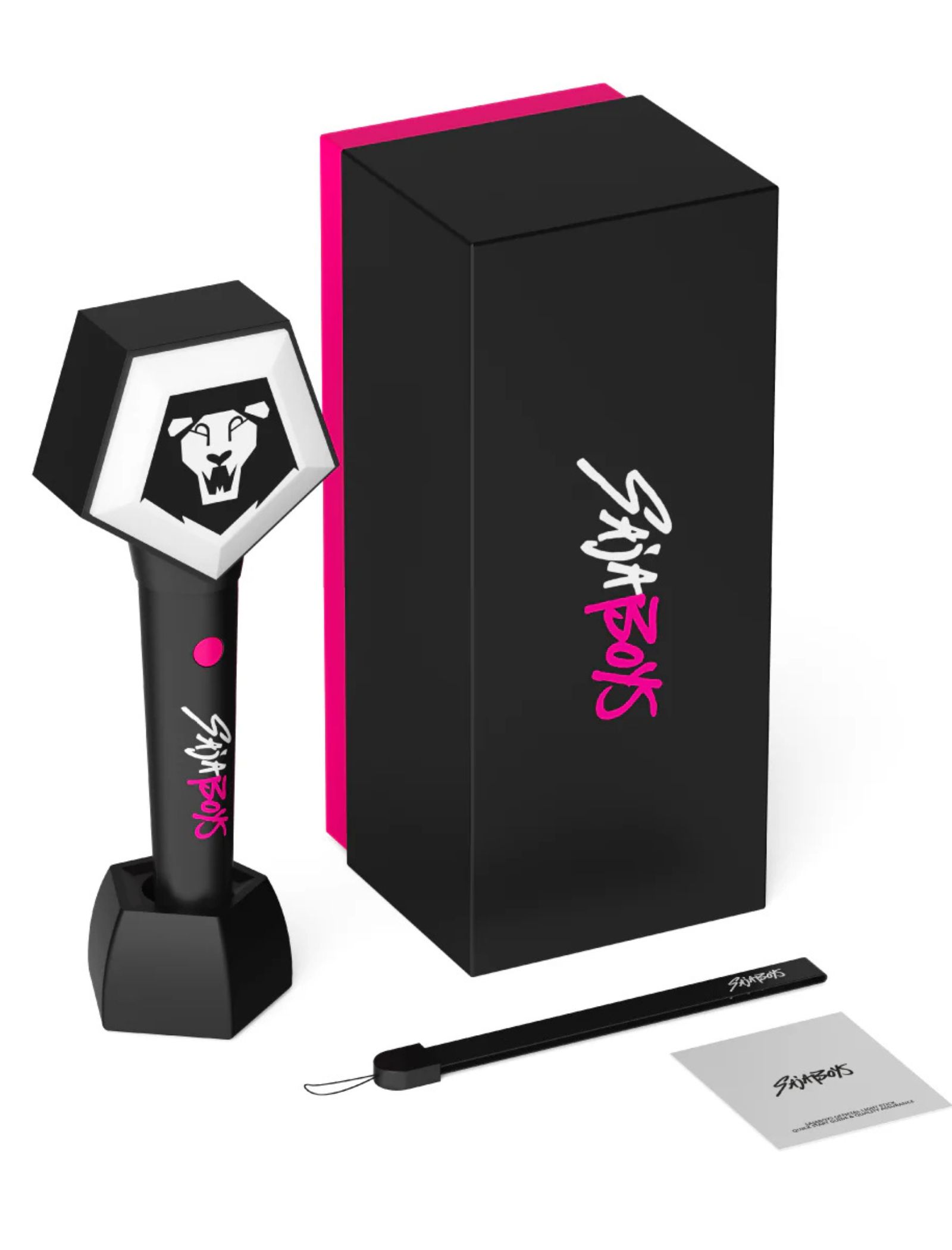 The Saja Boys lightstick is designed with a red hexagonal head and a lion emblem, reflecting the group’s fierce persona and aesthetic. Like the HUNTR/X lightstick, it is also crafted from durable materials.