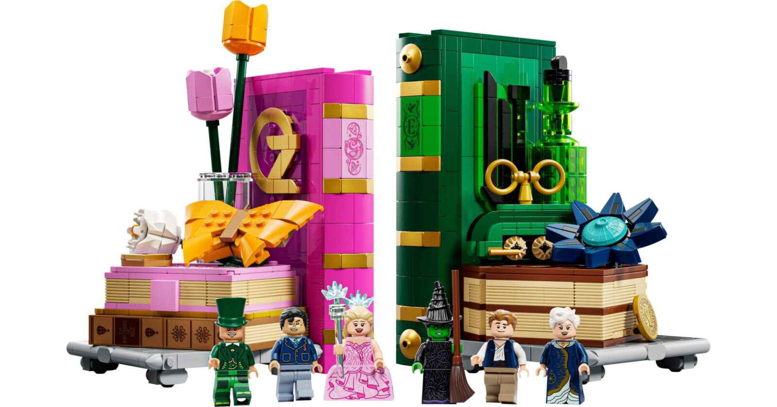 On the opposite end, Glinda’s pastel-pink bookend features a miniature Shiz University along with a compartment that holds minifigures of Madame Morrible and Pfannee.