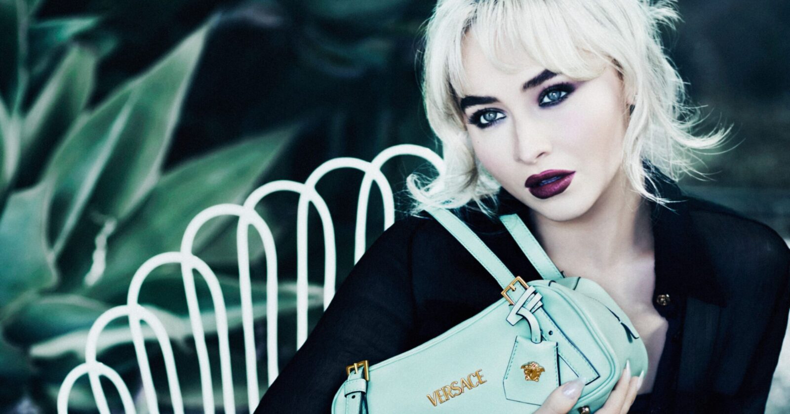 Sabrina Carpenter stars in Versace’s summer La Vacanza campaign, showcasing its signature Tag Bowling mini and shoulder bags and highlighting two new colorways: classic gold and a pool-inspired turquoise.