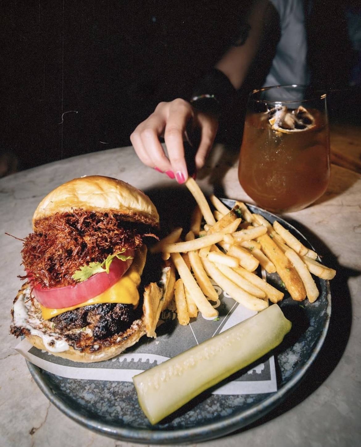 At Kampai, the ambiance is bathed in the glow of red lights, reminiscent of Tokyo’s nightlife. As you sip on their best-selling beverages and lose yourself to the beat of EDM, it’s just you and the electric energy of the moment. Yet, what truly distinguishes Kampai is its fusion of carefully curated Japanese cuisine with its innovative cocktails. At first glance, an amaretto sour may not seem like the typical pairing, yet the bold flavors of Japanese dishes elevate the drinking experience.