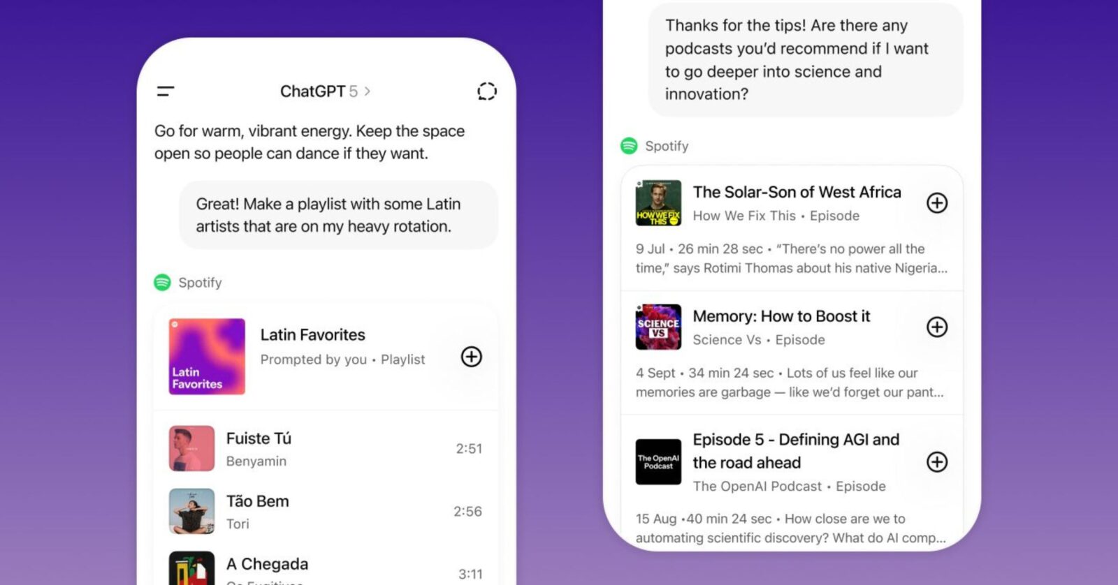 • You can ask for songs, artists, albums, playlists, or podcast episodes, and ChatGPT will open the Spotify app directly in your chat.