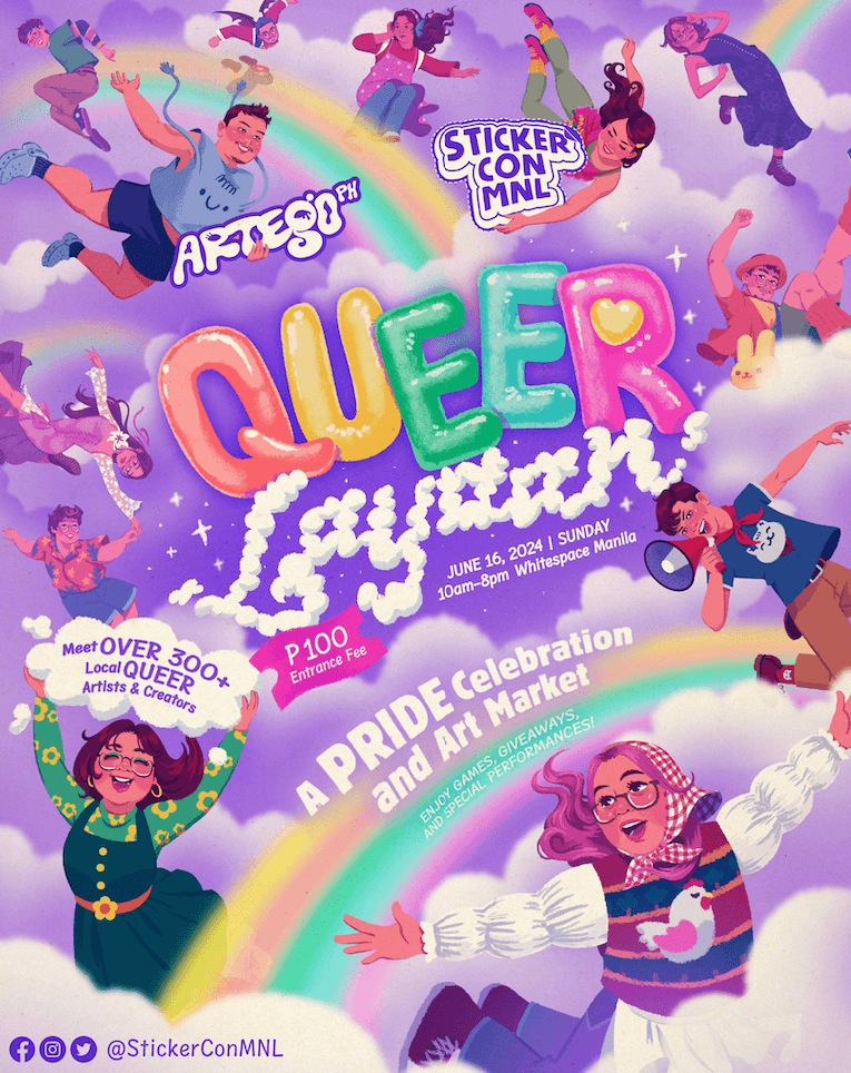 Presented by Artego PH and StickerConMNL, QUEERLayaan 2024 brings together more than 300 local queer artists and creators. It will be a day filled with activities such as games and even performances from the likes of Mrs. Tan, Emily Chon, and more.
