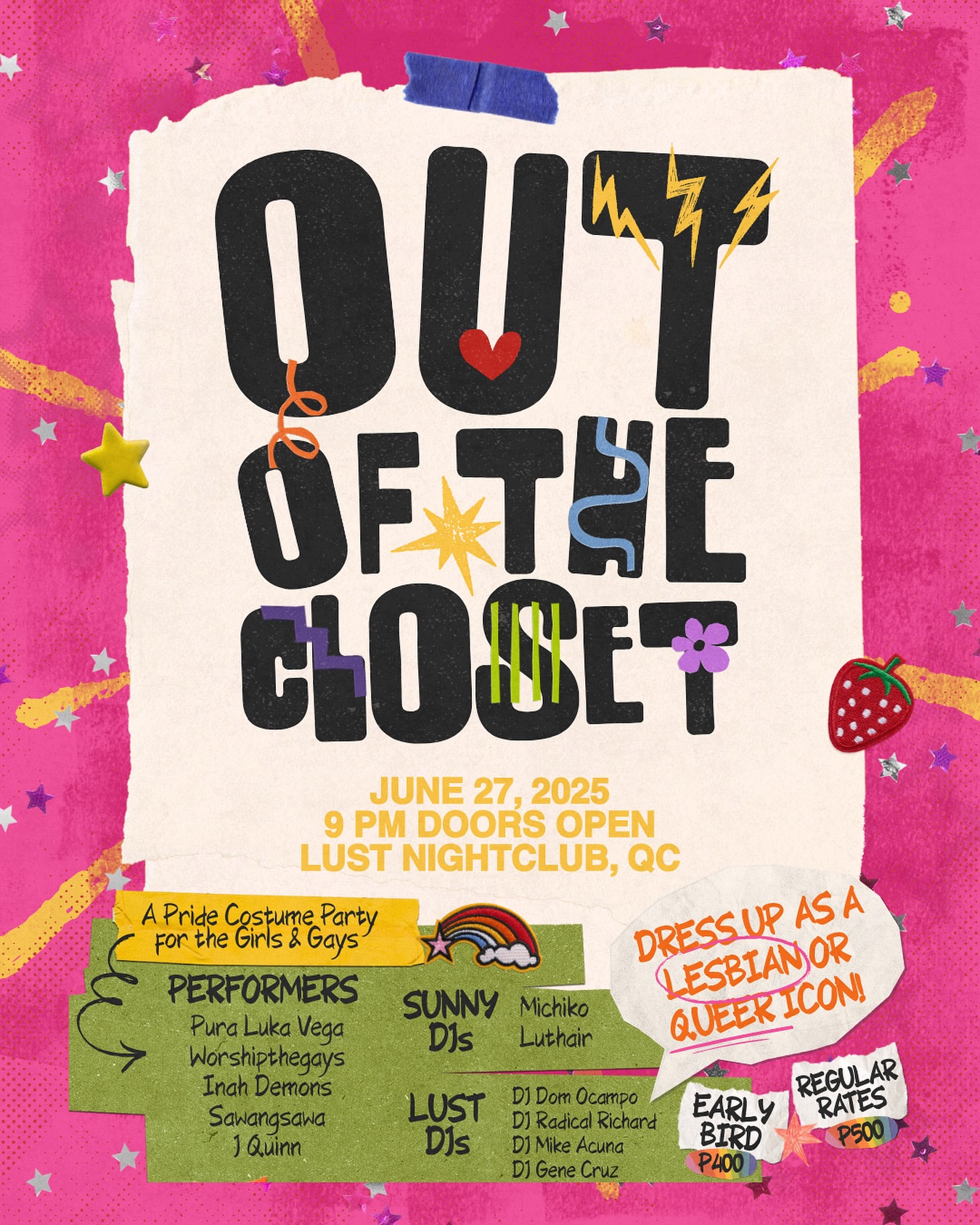 The Sunny Club PH’s Out of the Closet is a one-of-a-kind Pride costume party “for the girls and the gays,” set to take over Lust Nightclub is in Quezon City. Attendees are encouraged to dress up as their favorite lesbian or queer icons. The night will be packed with exciting sets from Sunny DJs Michiko and Luthair, along with Lust DJs Dom Ocampo, Radical Richard, Mike Acuña, and Gene Cruz.