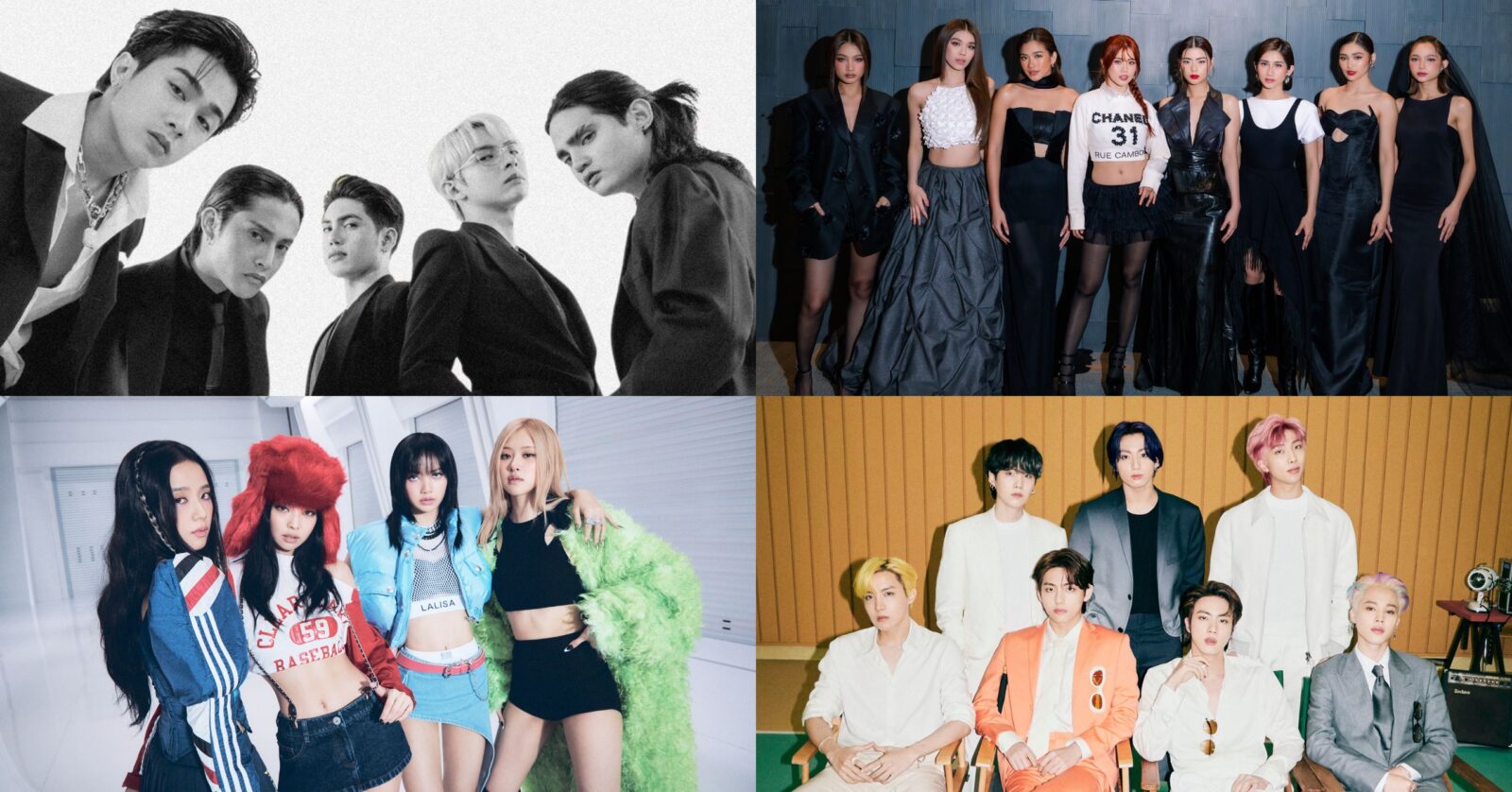 SB19: Courtesy of 1Z Entertainment, BINI: Courtesy of ABS-CBN, BLACKPINK: Courtesy of YG Entertainment, BTS: Courtesy of HYBE.