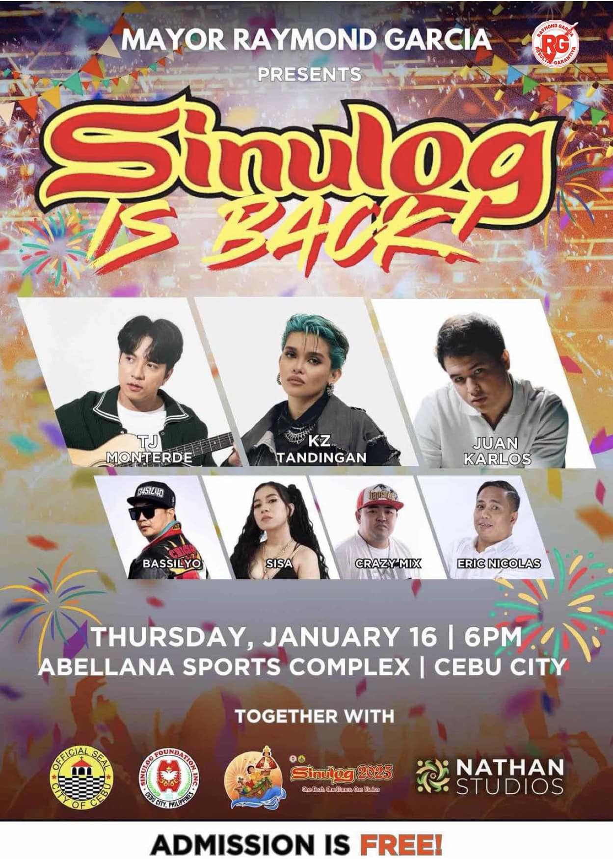 Presented by Cebu City mayor Raymond Garcia is ‘Sinulog Is Back’ – a free concert in celebration of Sinulog, featuring TJ Monterde, KZ Tandingan, juan karlos, and more.