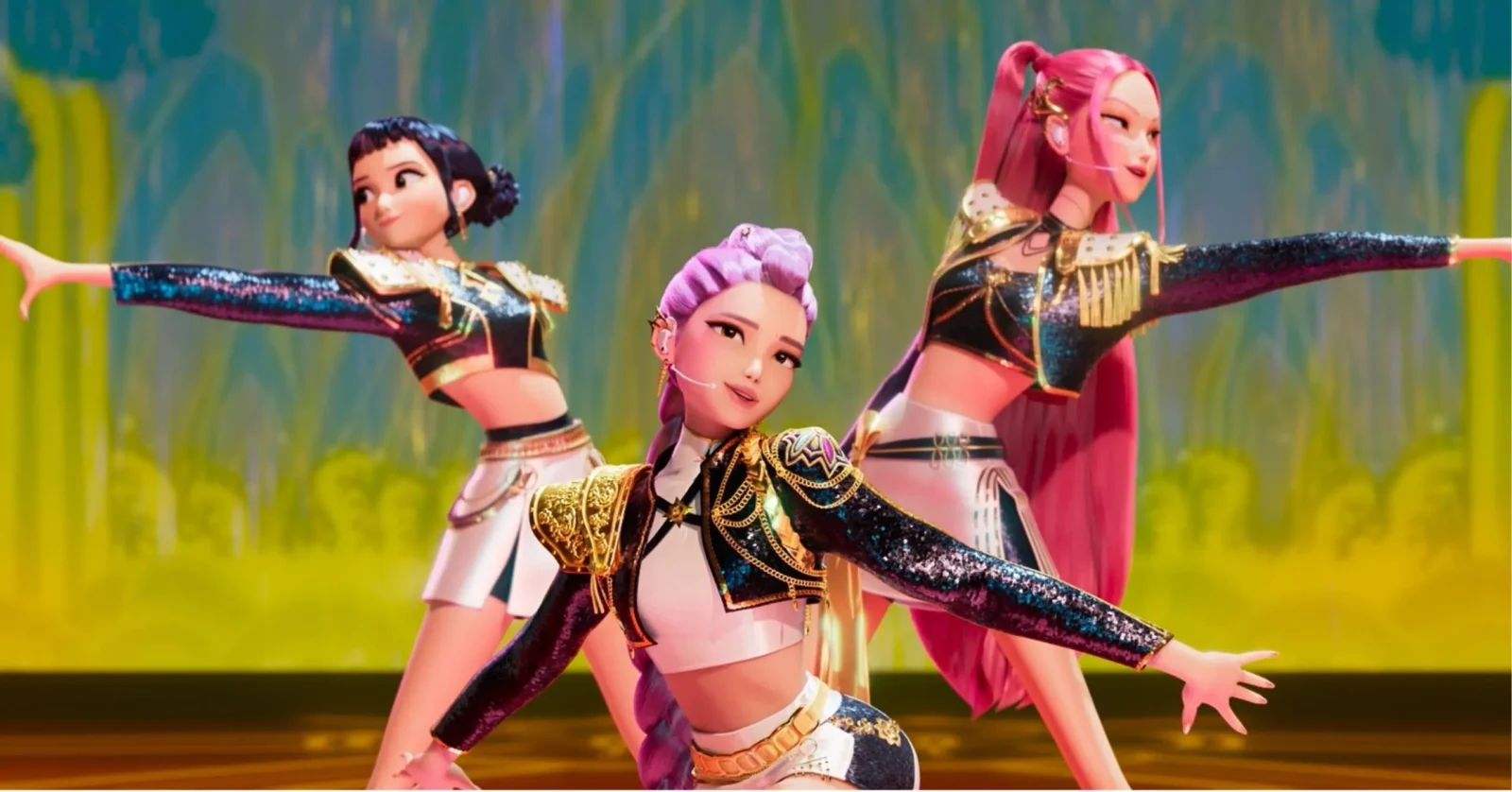 Lent the singing voices of EJAE (Rumi), Audrey Nuna (Mira), and REI AMI (Zoey), HUNTRIX is a fictional KPop girl group responsible for protecting their universe by fighting against demons and inspiring fans with their music.