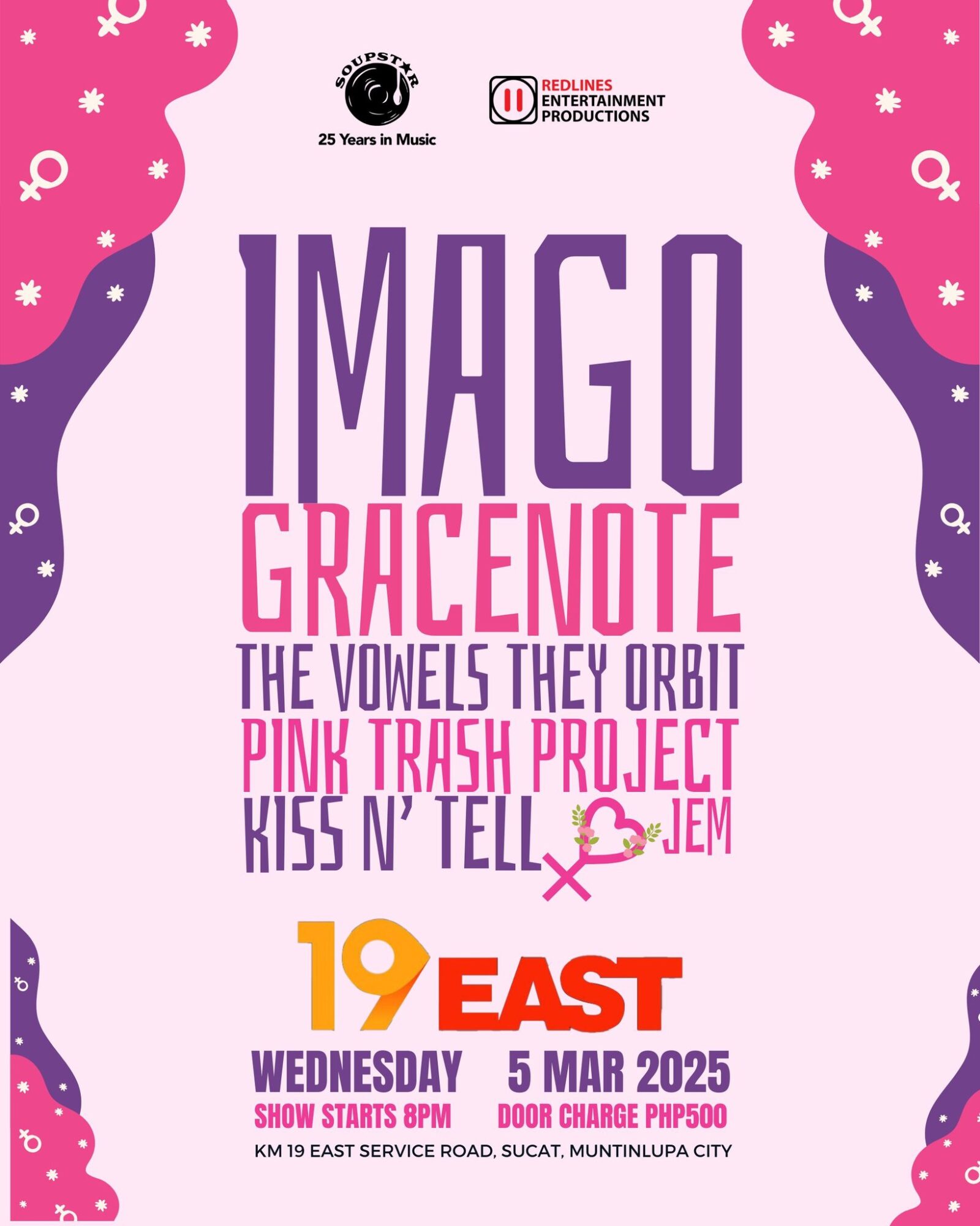 19 East will be hosting a special gig for Women’s Month. The show will feature a lineup that includes Imago, Gracenote, the vowels they orbit, Pink Trash Project, Kiss N’ Tell, and Jem.