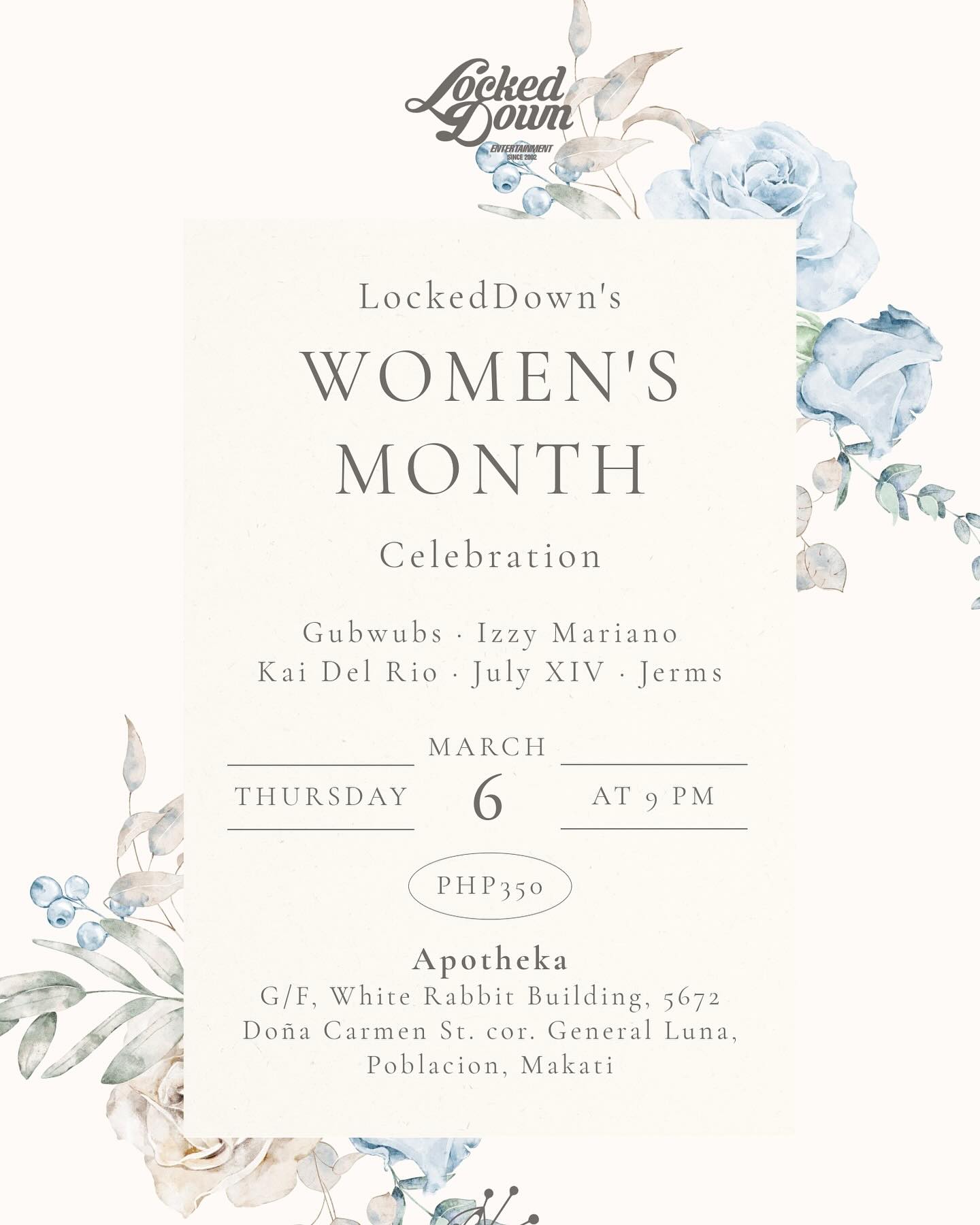 Locked Down Entertainment is throwing its very own gig to celebrate Women’s Month in Makati City. The Poblacion show will feature Gubwubs, Izzy Mariano, Kai Del Rio, July XIV, and Jerms.