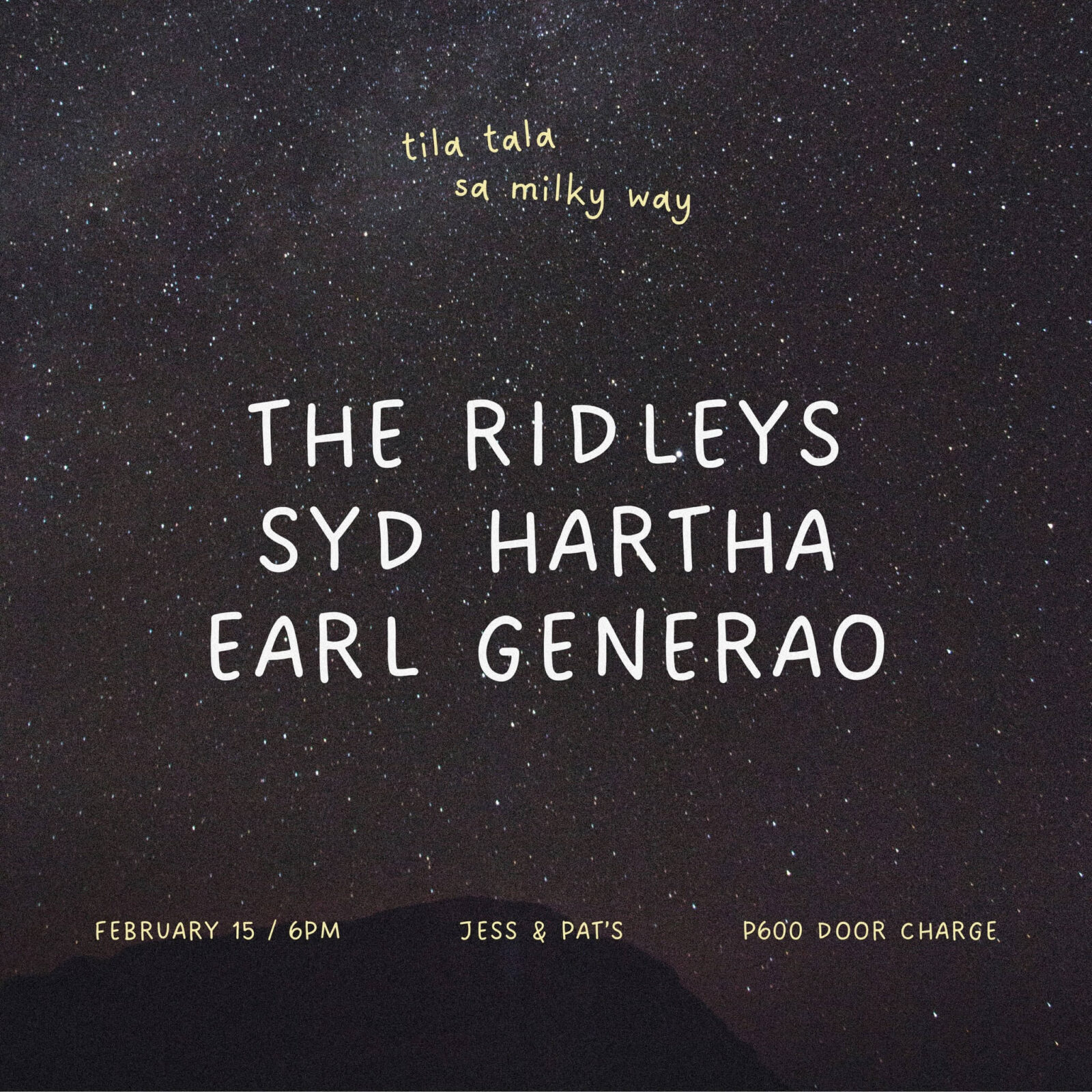 The Ridleys, syd hartha, and Earl Generao will be performing back-to-back sets at Jess & Pat’s this February 15. They will be sharing the stage for a special post-Valentine’s gig at the beloved Maginhawa venue.
