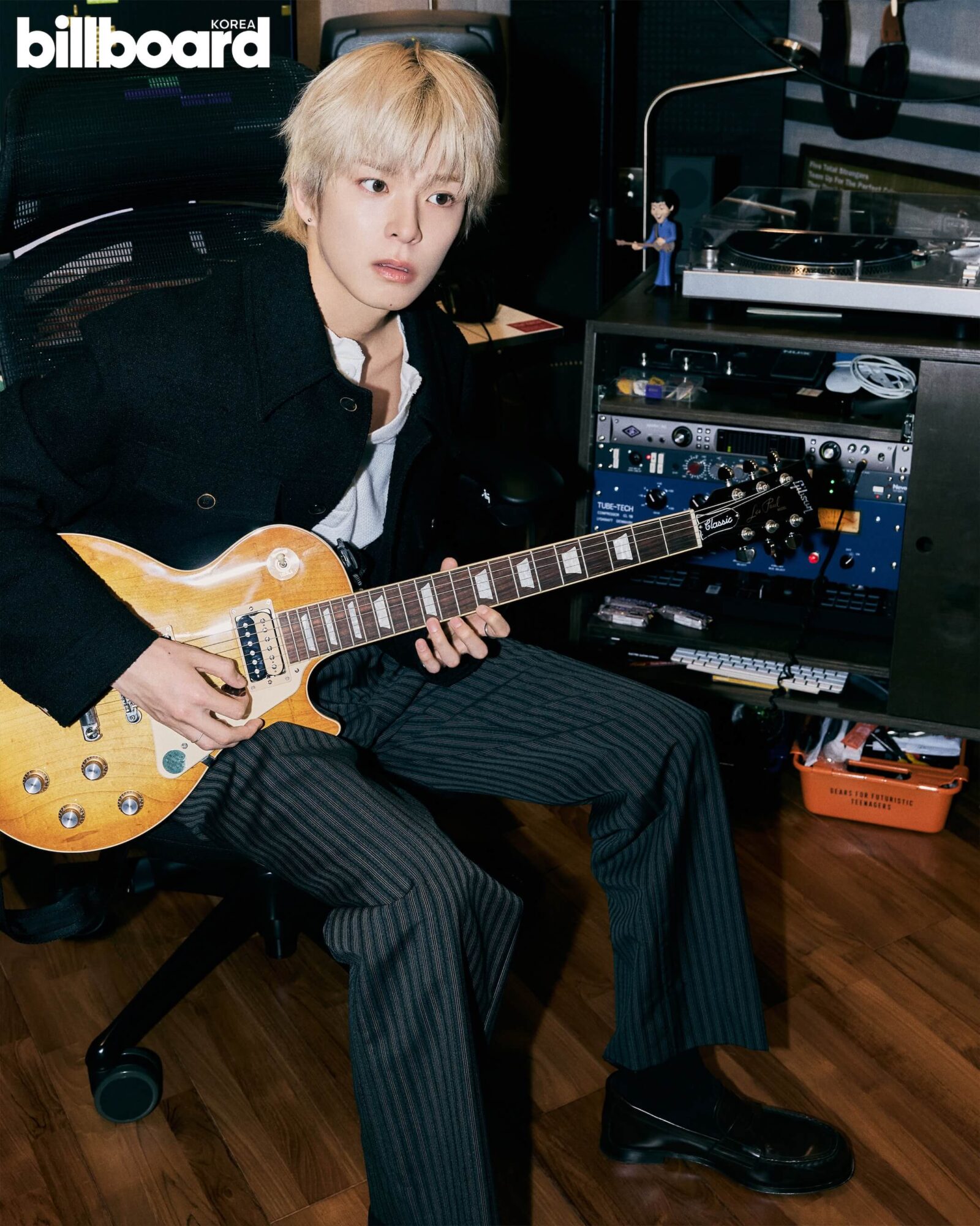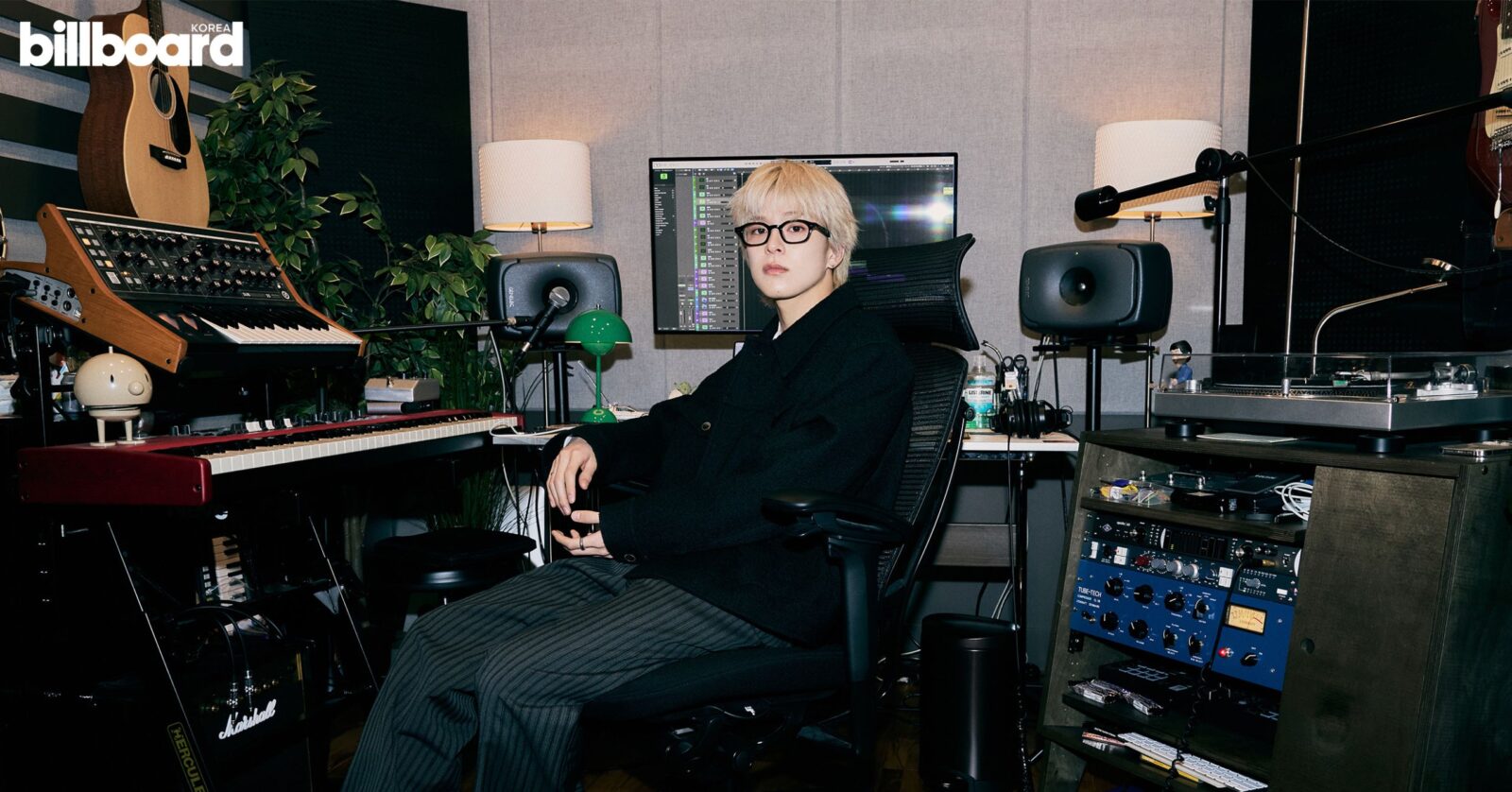 I’ve actually changed the interior several times. I used to have a huge monitor screen here so I could watch movies or play games with the members and even eat here, but I removed all of that. There’s a cabinet I built myself that I’m very fond of. This keyboard is something I use only as a MIDI keyboard, which feels a bit wasteful because it actually has a lot of features (laughs). Other than that, it’s probably similar to any other studio—preamps, compressors, equipment needed for recording. Guitar and piano help me when making music, so I’ve been studying them little by little.