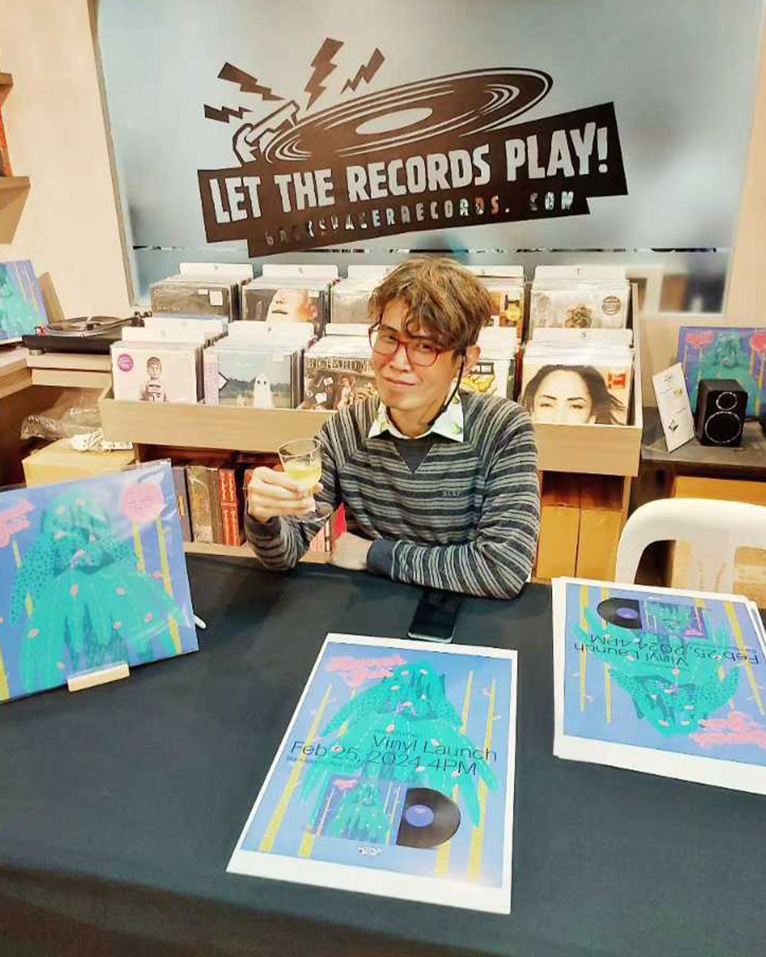Mikey Amistoso signing records at the Hannah + Gabi vinyl launch at Backspacer Records (photographed by Marian Hernandez)