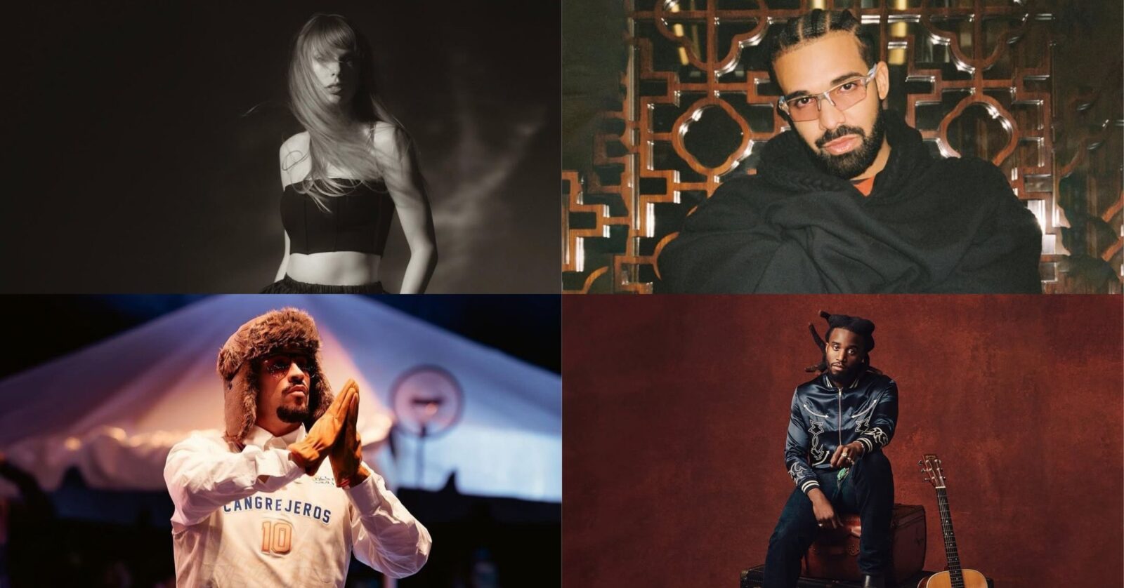 TAYLOR SWIFT, DRAKE, BAD BUNNY, & SHABOOZEY: Courtesy of @taylorswift, @champagnepapi, @badbunnypr, and @shaboozey respectively
