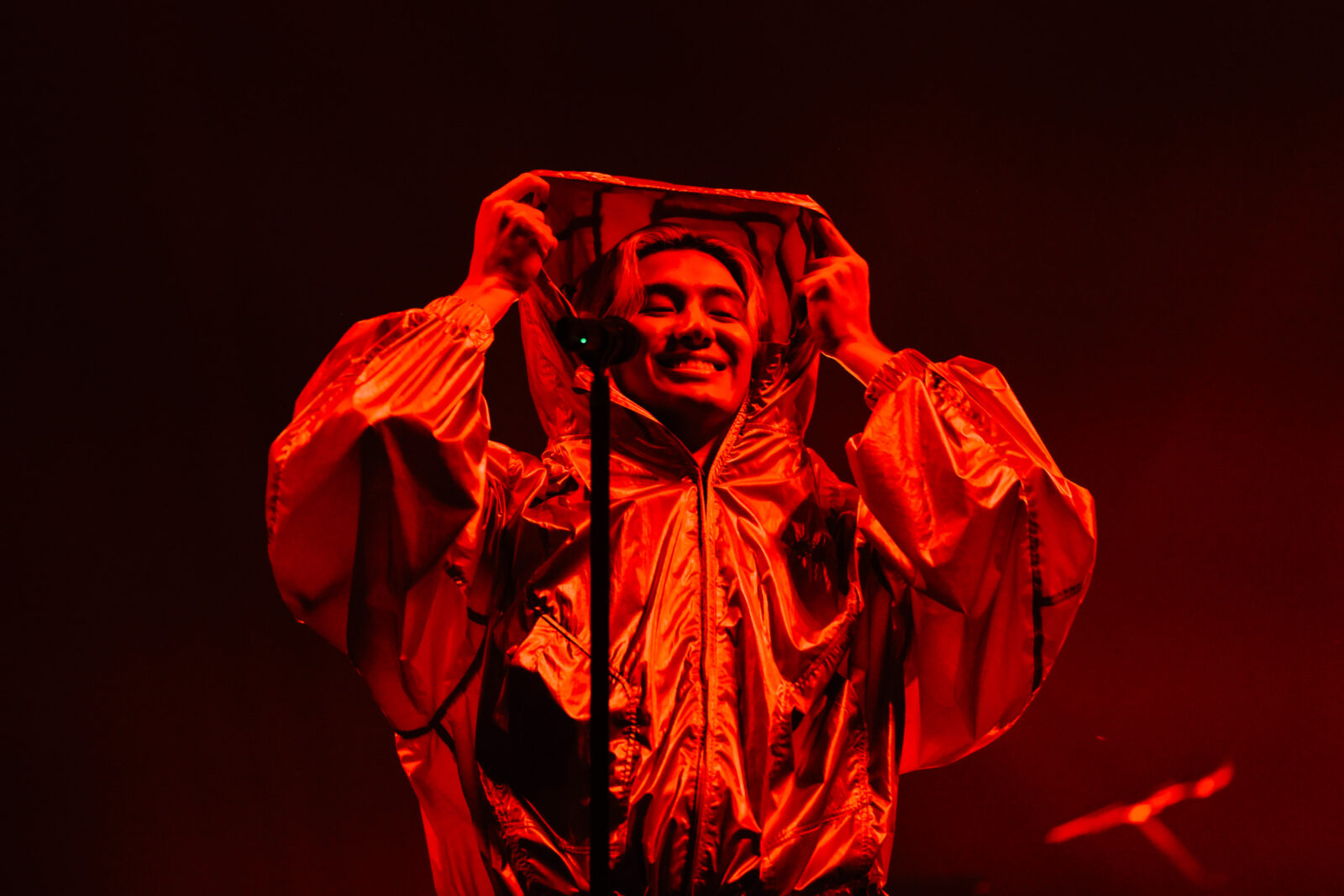 The show began with a rather serene opening. As videos of Fujii on the large LED screens heralded his arrival, I could observe how completely captivated those in attendance were as his figure finally manifested on stage. Lit up by a single spotlight and cloaked in a massive hood, he immediately went into an acapella intro of “YASASHISA.”
