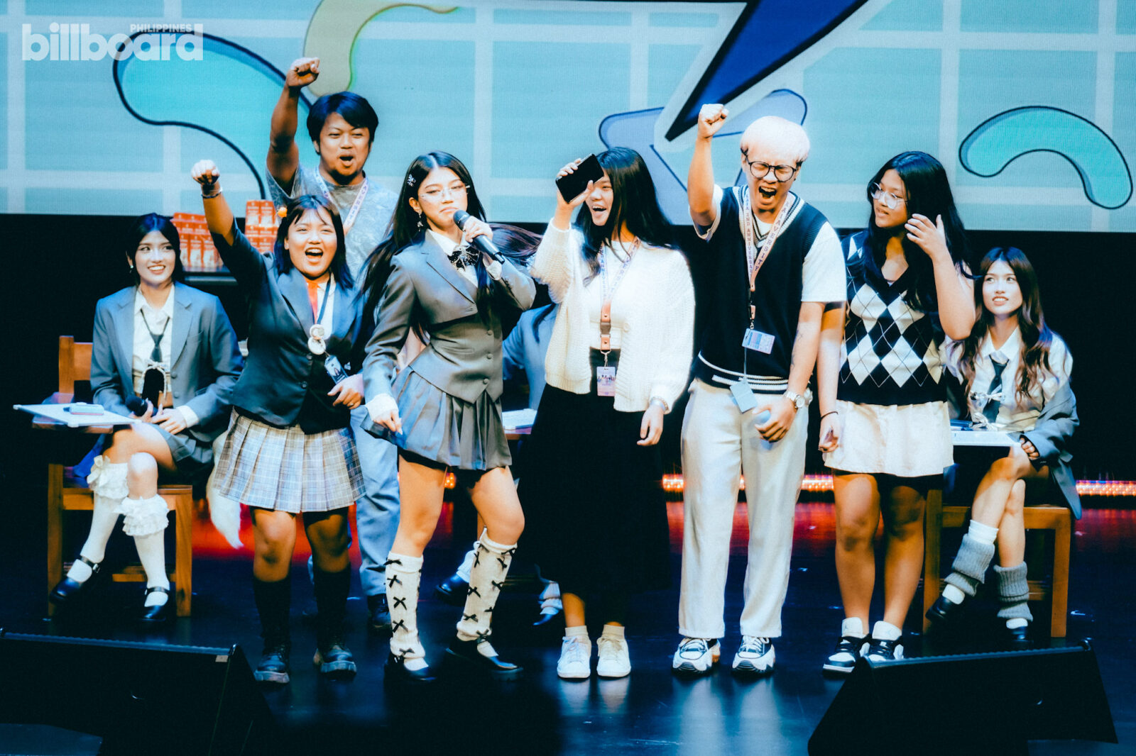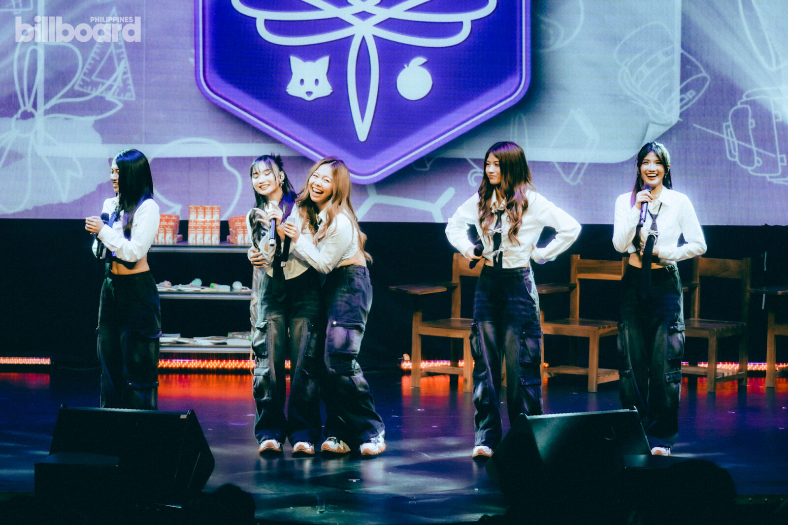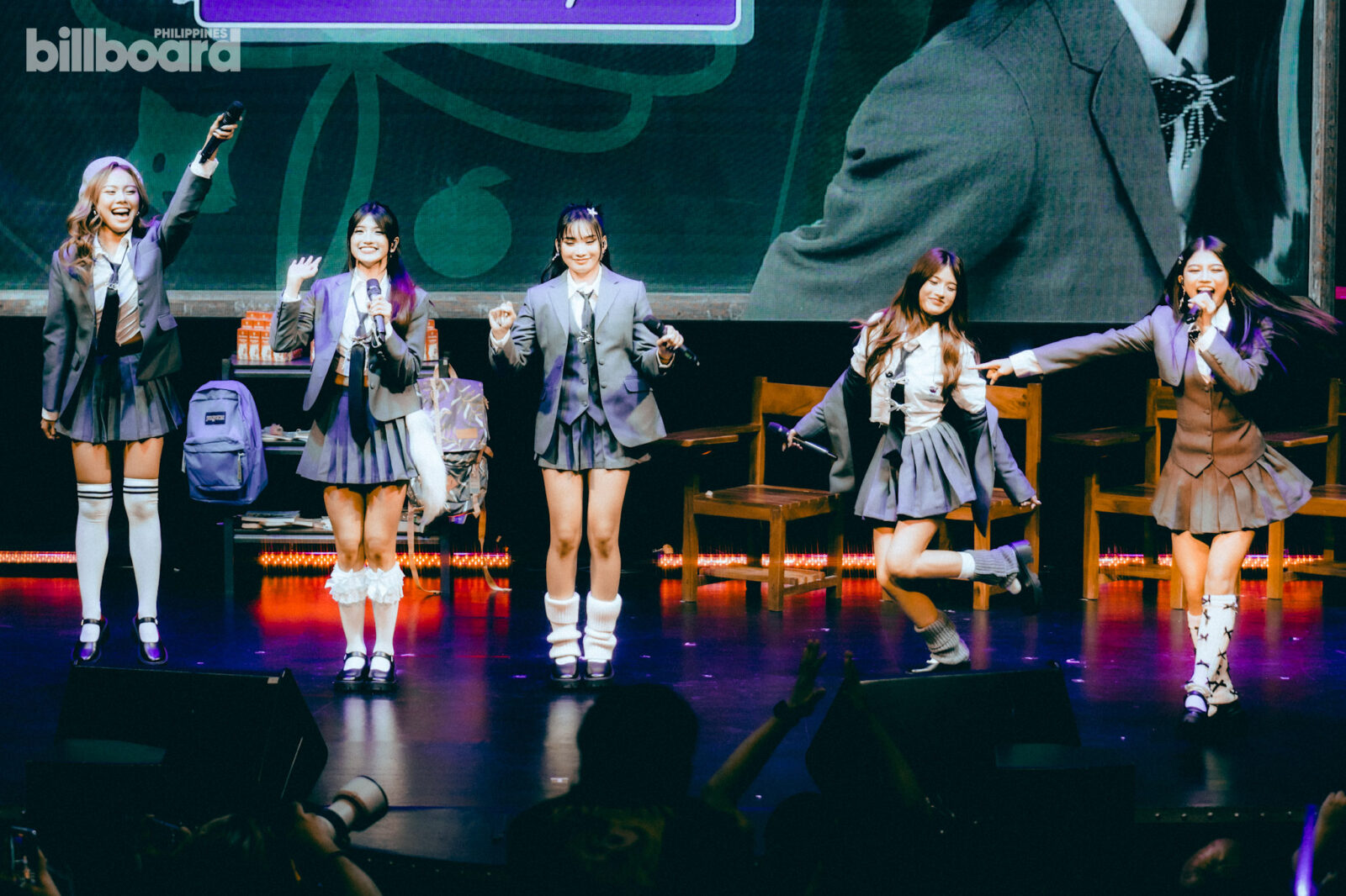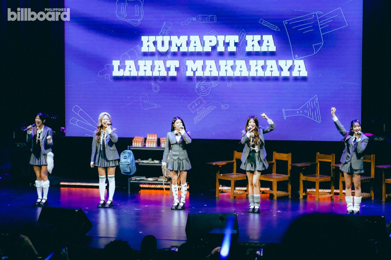 All of this, including the main concert proper later on, was happening against a simple stage design that was made to mimic a classroom – complete with the likes of school armchairs, small shelves and cabinets filled with books, backpacks, and even a whiteboard jokingly listing the group’s members for being “noisy” and such.
