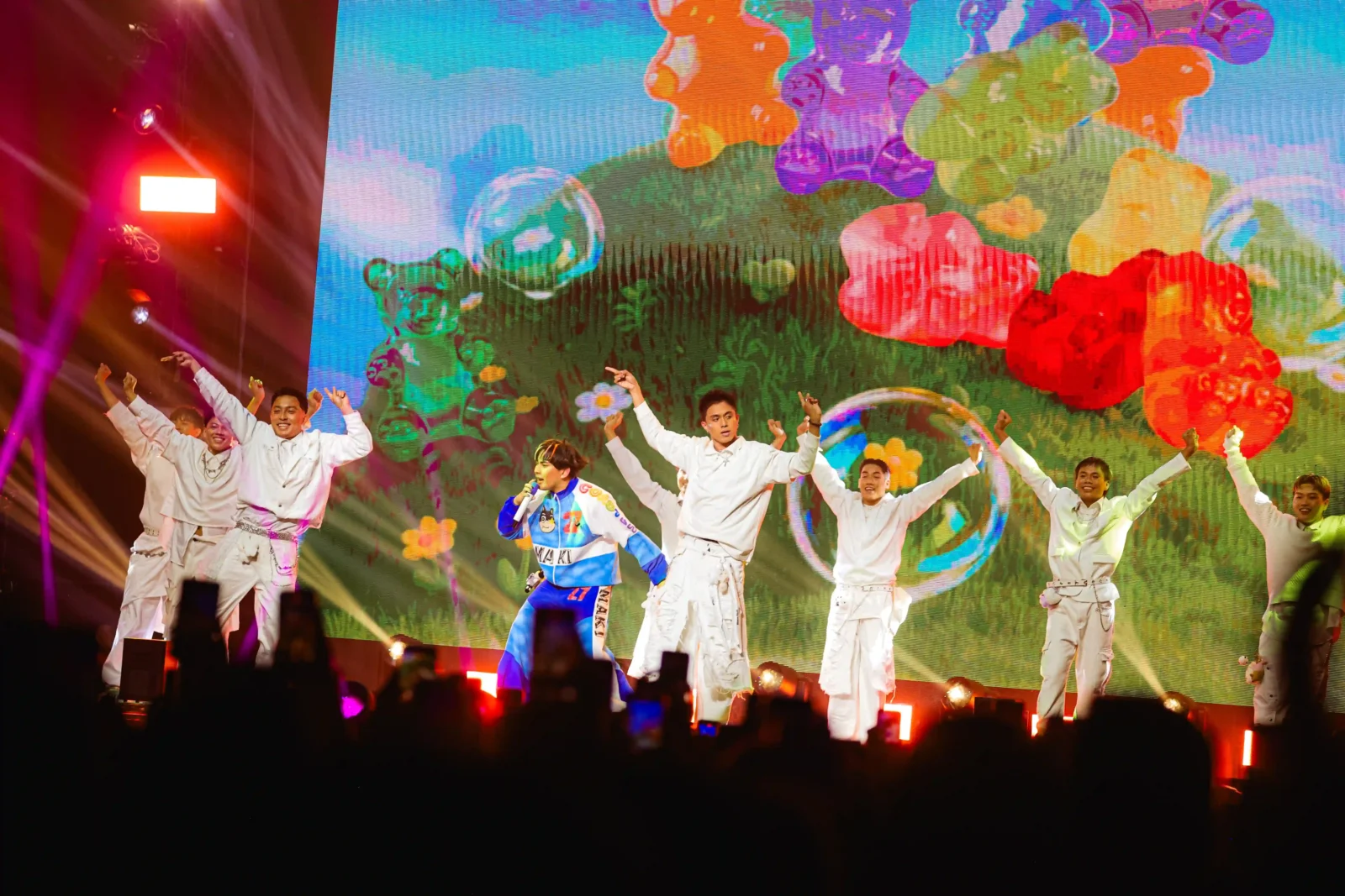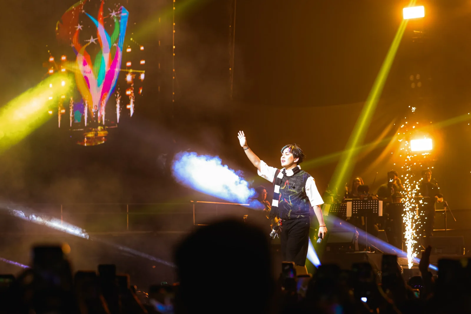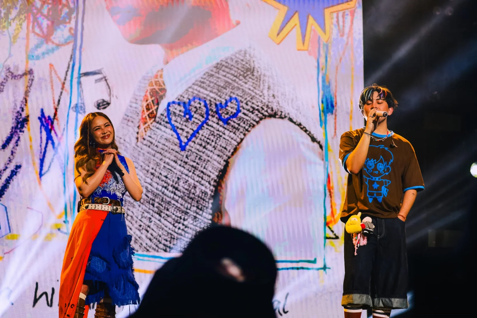 Before the show officially began, the massive screens played an introductory video styled like an anime opening. Here, a cartoon version of Maki sprints through his many eras under the Kolorcoaster experience, from “Namumula” to “Dilaw.” Emerging from below the stage, the hitmaker roused the audience with an array of his biggest hits to date: “Kahel Na Langit,” “Kailan?” “Kurba,” and “Bughaw.”