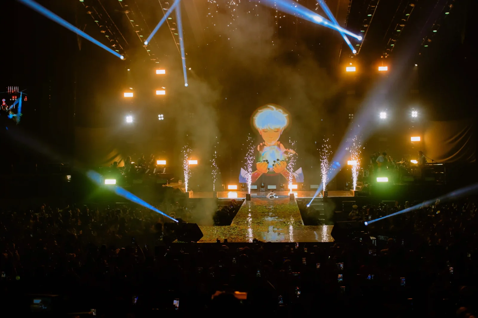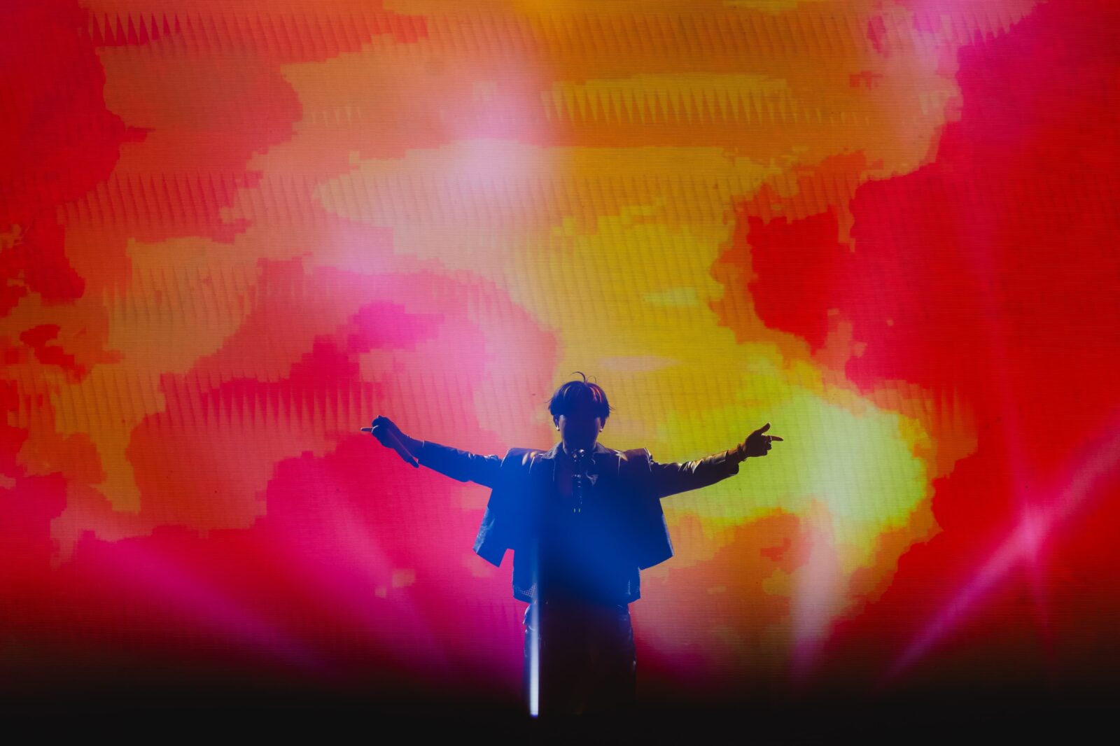 Entering the venue alone, I could immediately feel the electricity in the air as the stage design revealed itself to be unlike the usual setup. Two large LED screens stood perpendicular to each other (one stretching across the stage and another extending above it along the ceiling) surrounded by a sea of lights. The intention behind the set design was clear during the show — the screens and lights would bathe the entire coliseum in vibrant color.